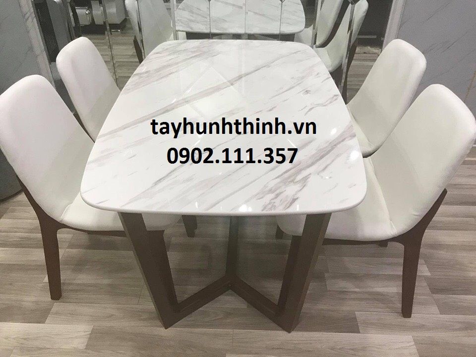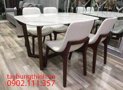 Mẫu bàn ăn với mặt bàn được làm từ đá Marble nhân tạo với những đường vân đẹp mắt . Chân bàn được làm từ gỗ tự nhiên đã qua xử lý chống mối mọt đảm bảo độ bền khi sử dụng.